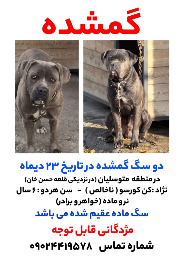 خواهر و برادر که (سگ ماده عقیم شده است )در منطقه متوسلیان در نزدیکی قعله حسن خان در تاریخ ۲۳ دیماه گمشده اند