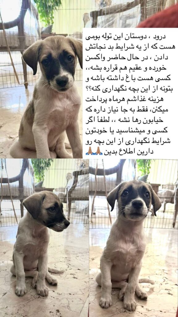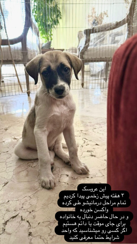 پناه یه توله ماده که زخمی پیداش کردیم تمام مراحل درمانی طی کرده واکسینه شده و گواهی سلامت داره، چون ۴۰ روزه برای مراحل درمانتوی خونه بوده حتی شرایط زندگی توی خونه رو هم داره جای دستشویی و جای خواب رو میشناسه، دلیل واگذاریمم اینه مه خودم ۶ تا سگ دارم و توان اضافه کردن ندارم ، در حال حاضر پناه ۳/۵ ماهه