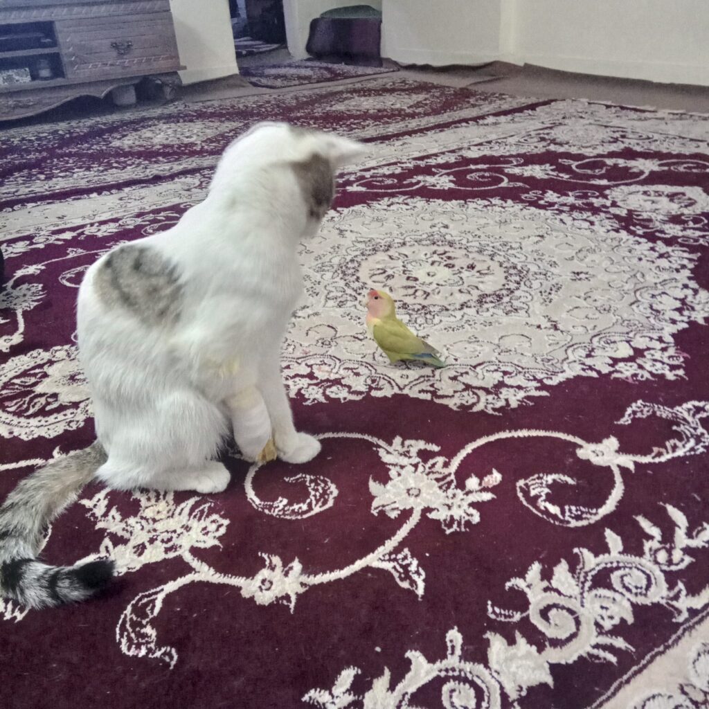 سالم و سرحال دستش یکم آسیب دیده بود که مراحل درمانیش داره طی میشه حدودا ۵ ماهشه دو هفتس پیش خودمه واکسیناسیون نشده ولی به شدت بغلی و خرخری و باهوشه راحت میشه ناخوناشو گرفت حتی با پرندههای کوچیک کاری نداره ما تو خونه طوطی برزیلی داریم که آزاد میچرخه تو خونه اصلا چنگ نمیگیره هنوز فحل نشده ولی اگه شد خودم تو هزینه عقیم سازی کمک می کنم خودم گربه دارم که چون همیشه تنها بوده الان نمیتونه باهاش کنار بیاد اصلا دعوا نمیکنن ولی گربه خودم از غذا خوردن افتاده