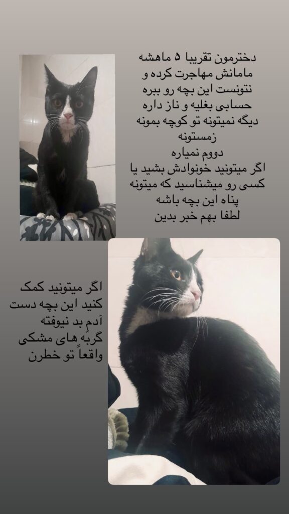 این بچه تا چند روز پیش خونواده داشت ولی مجبور به مهاجرت اجباری شدن و نتونستن این طفلک رو ببرن خیلی کوچیکه خیلی کوچیکتر از عکسش صورتش اندازه یه کف دسته و به شدت بغلیه تو خیابون از پس خودش برنمیاد هوا هم داره سرد میشه دووم نمیاره و از طرفی مشکی هم هست و بیشتر در خطره لطفا اگر میتونید پناهش بشید