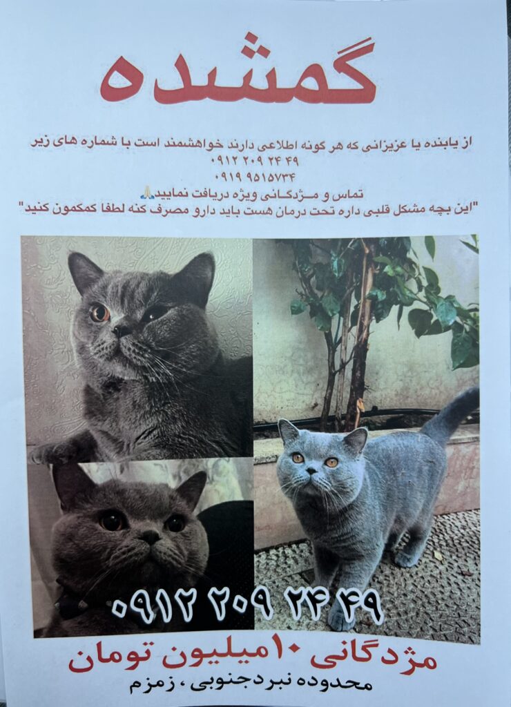 گربه نر عقیم شده ۲ سالشه اسمش پنی هست به اسمش واکنش نشون میده بچم مشکل قلبی داره باید دارو مصرف کنه از دیروز تاریخ ۱۴۰۴/۰۸/۰۹ گم شده