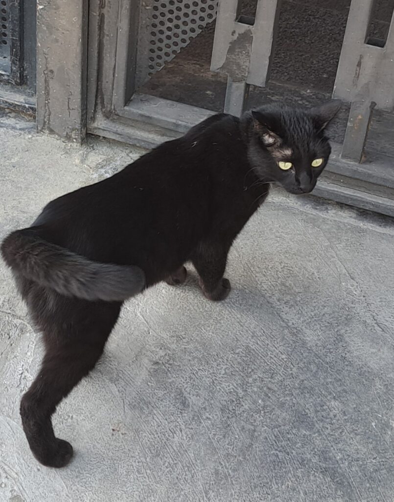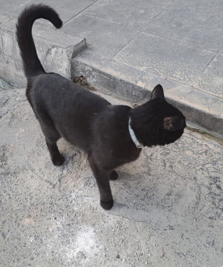 گربه مشکی با چشم های سبز رنگ و قلاده آبی کاملا خونگی در خیابان گرمسار شرقی